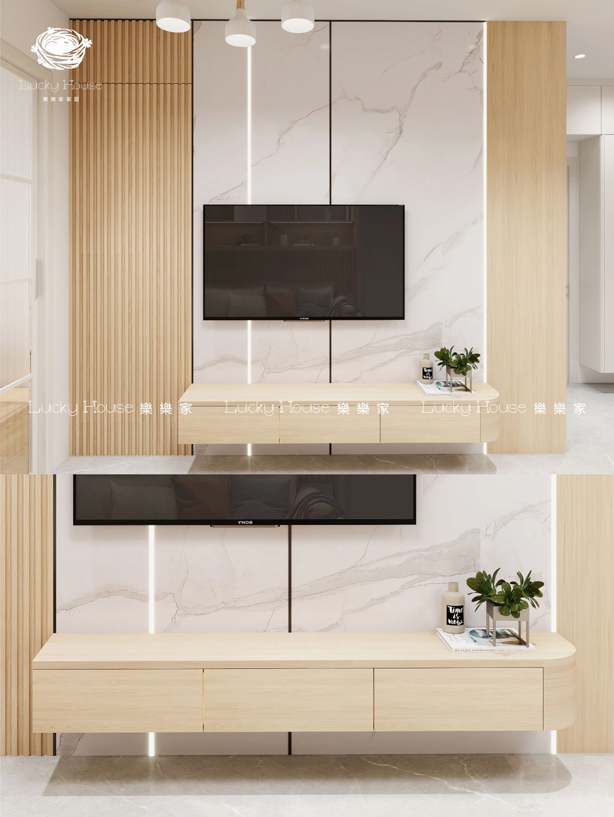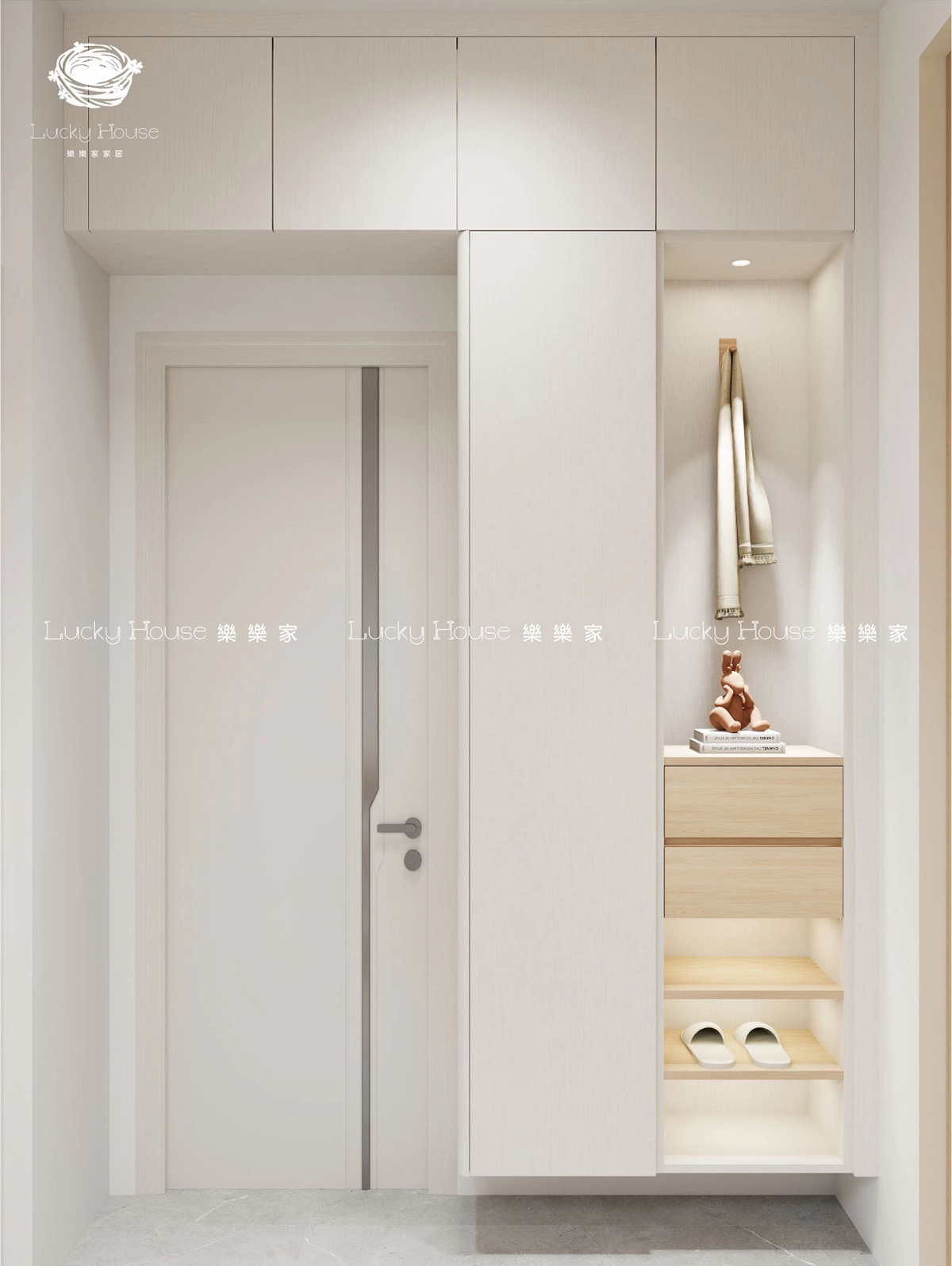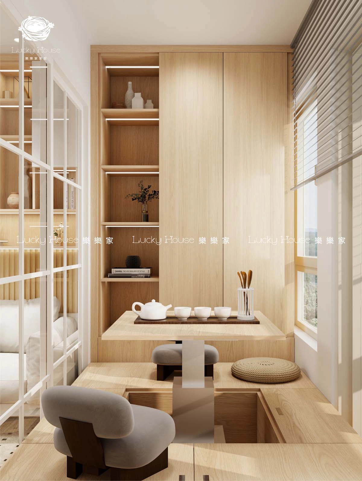 細戶型單位空間珍貴,樂樂家呢套廳隔房百變地台設計就針對呢個問題,以多功能、慳位為核心,將廳隔房、百變地台床、懸浮玄關櫃、懸浮電視櫃、多功能餐邊櫃、多功能衣櫃同埋上床下櫃等設計融入,打造出一個靈活又舒適嘅家居環境。