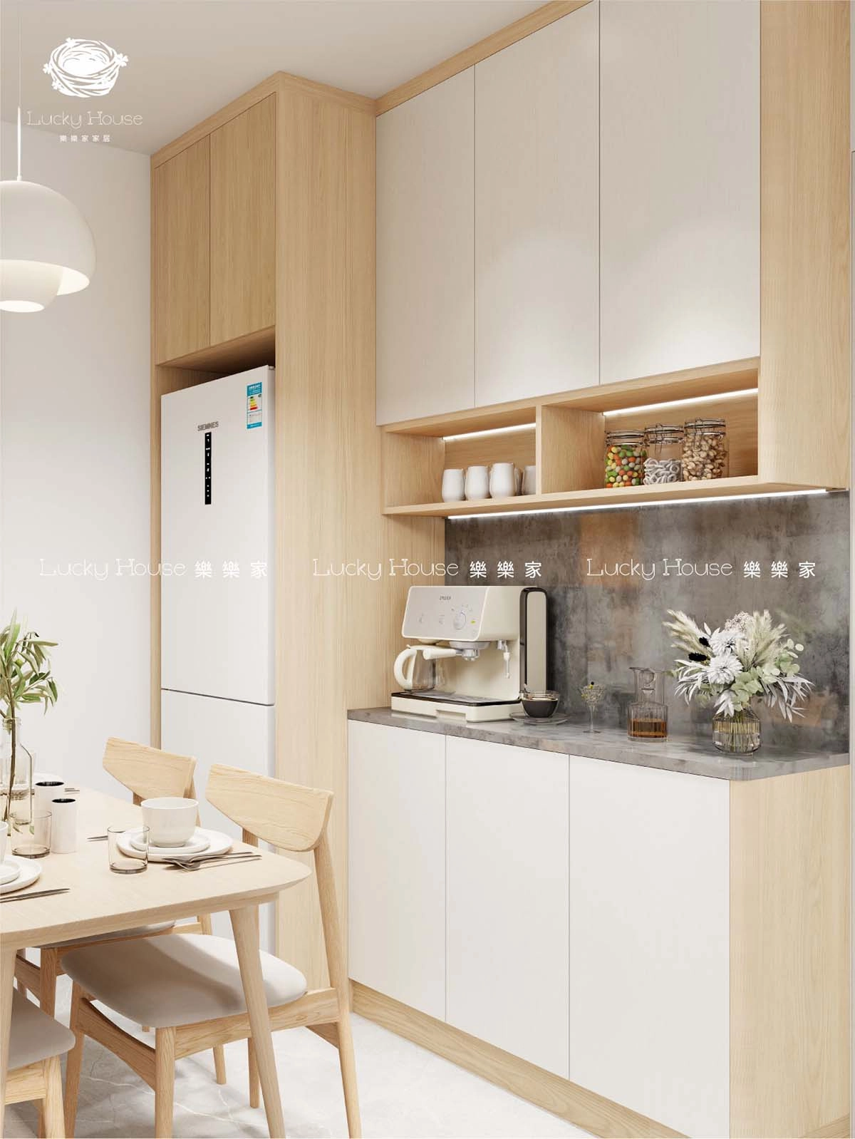 多功能餐邊櫃絕對係廚房好拍檔!除咗基本儲物空間,仲可以預留位置放咖啡機、熱水壺等電器,煮飯煮咖啡都好方便。上面嘅開放式層架可以擺餐具、裝飾品,增加用餐氛圍。對於鍾意招呼朋友嘅人,呢個餐邊櫃可以擺酒、零食,聚會時隨手就有得食得飲。
