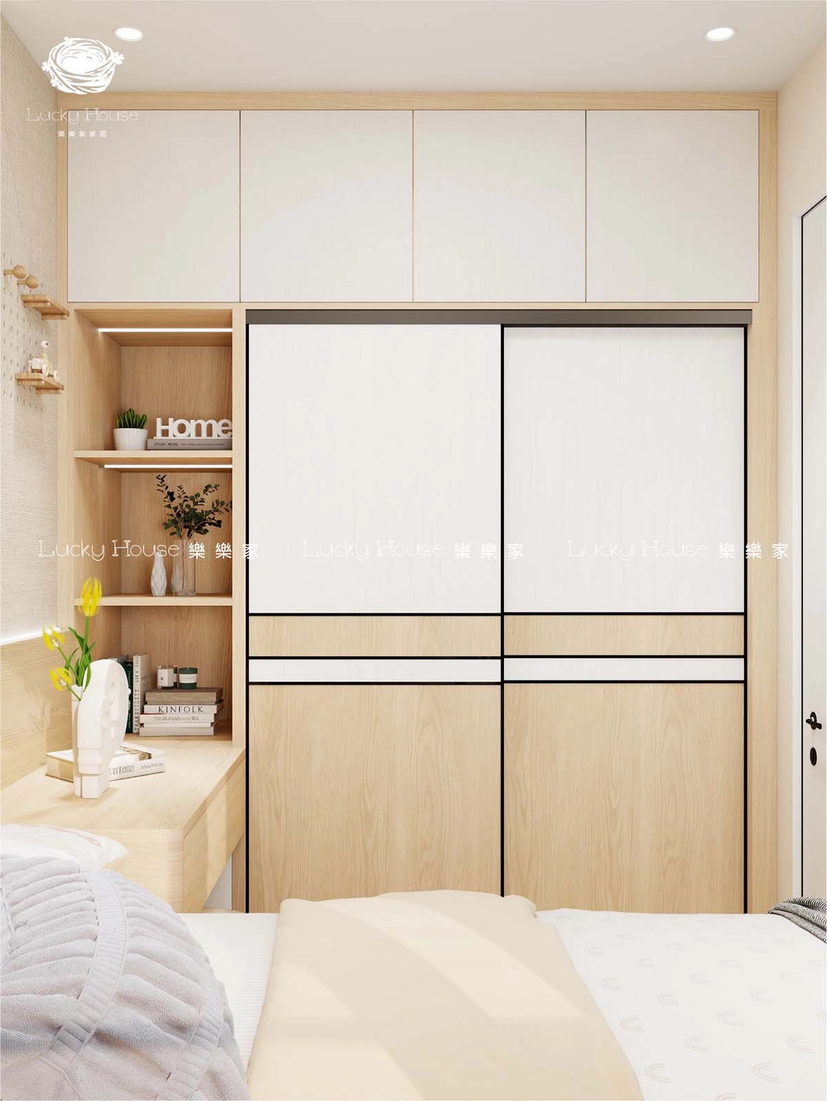 多功能衣櫃滿足所有儲物需求!入面有掛衫區、疊衫區、抽屜,甚至可以加書架、飾物格。無論係衫褲鞋襪,定係雜物、書籍,都可以整齊擺放。門面設計亦都好靚,簡約風格襯到全屋,唔單止實用,仲係房間嘅裝飾一部分。