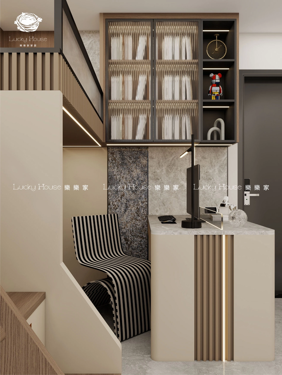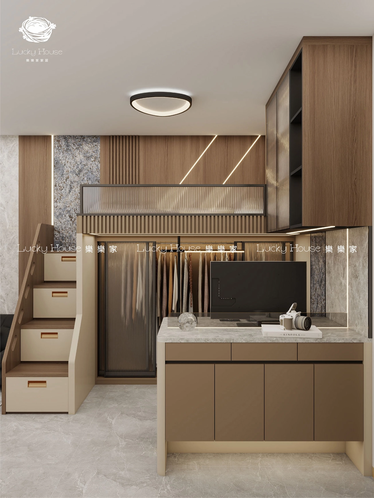 大理石紋理嘅工作台面,高貴耐用,擺放電腦、裝飾品毫無壓力;吊櫃部分更係「收納狂魔」——玻璃門收納書籍,開放式層架擺小擺設,櫃桶收納文件雜物,統統「一網打盡」。呢個區域緊貼組合床梯櫃,利用牆角空間「零浪費」,唔使額外擺書枱,直接慳出「一闊三大」嘅空間。無論返工、讀書定係閱讀,呢個角落都「啱曬」,收納充足又整潔,簡直係細戶型嘅「工作區救星」!