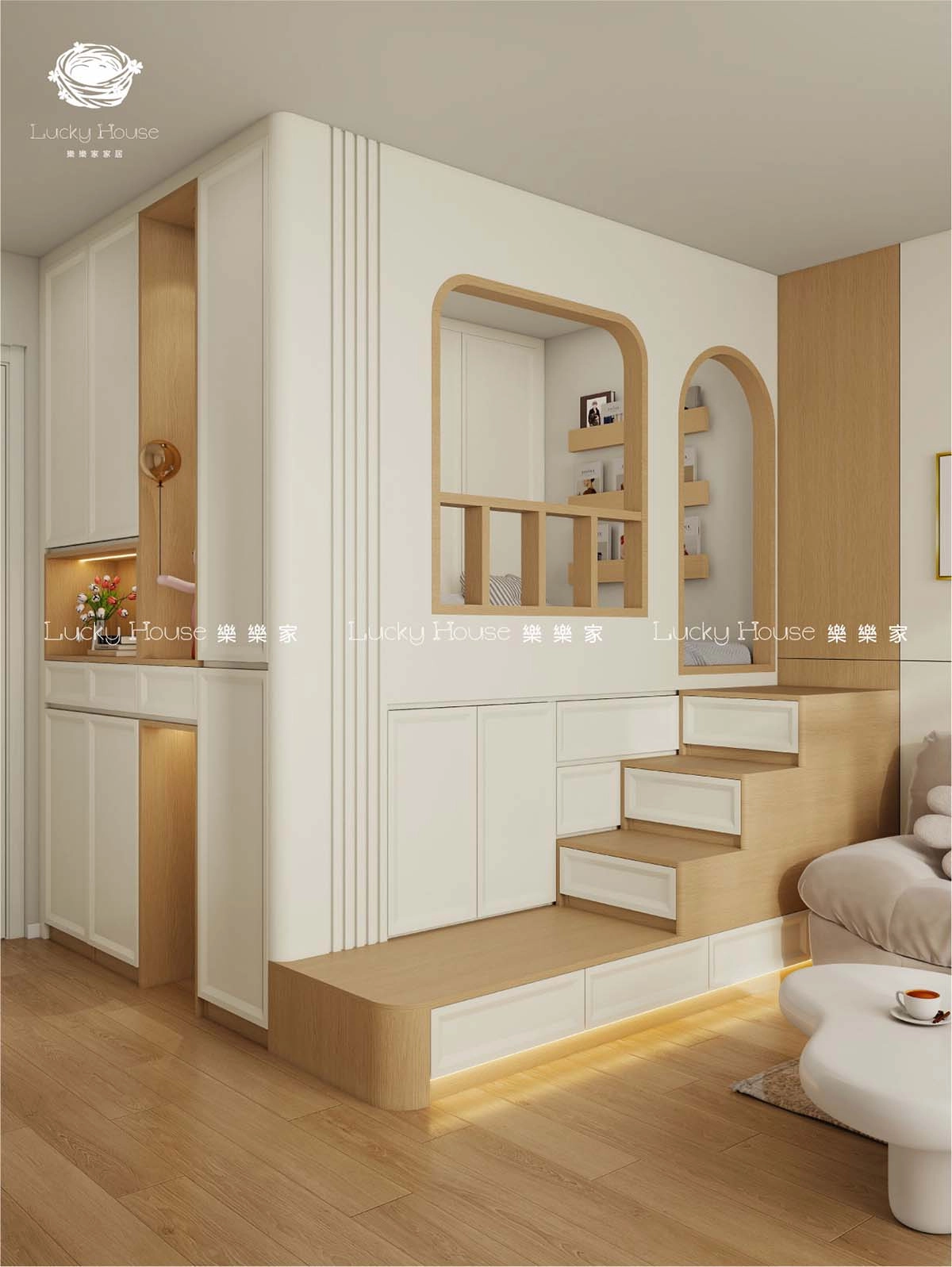 連接廳間房同客廳嘅梯櫃,簡直係「空間魔法」嘅巔峰!樓梯踏步全部設計成抽屜,每一步都可以拉開收納——小朋友玩具、書本雜誌、過季衣物,統統塞得落,積少成多勁慳位;梯櫃旁邊同樣用拱門造型開口,望過去可以瞥見廳間房嘅溫馨佈置,增加空間層次感;最貼心係踏步底部暗藏燈光,夜晚行樓梯唔使摸黑,安全又有氛圍。淺木色梯櫃同整體風格一體化,完全唔覺得係「雜物櫃」,反而像件裝飾品。