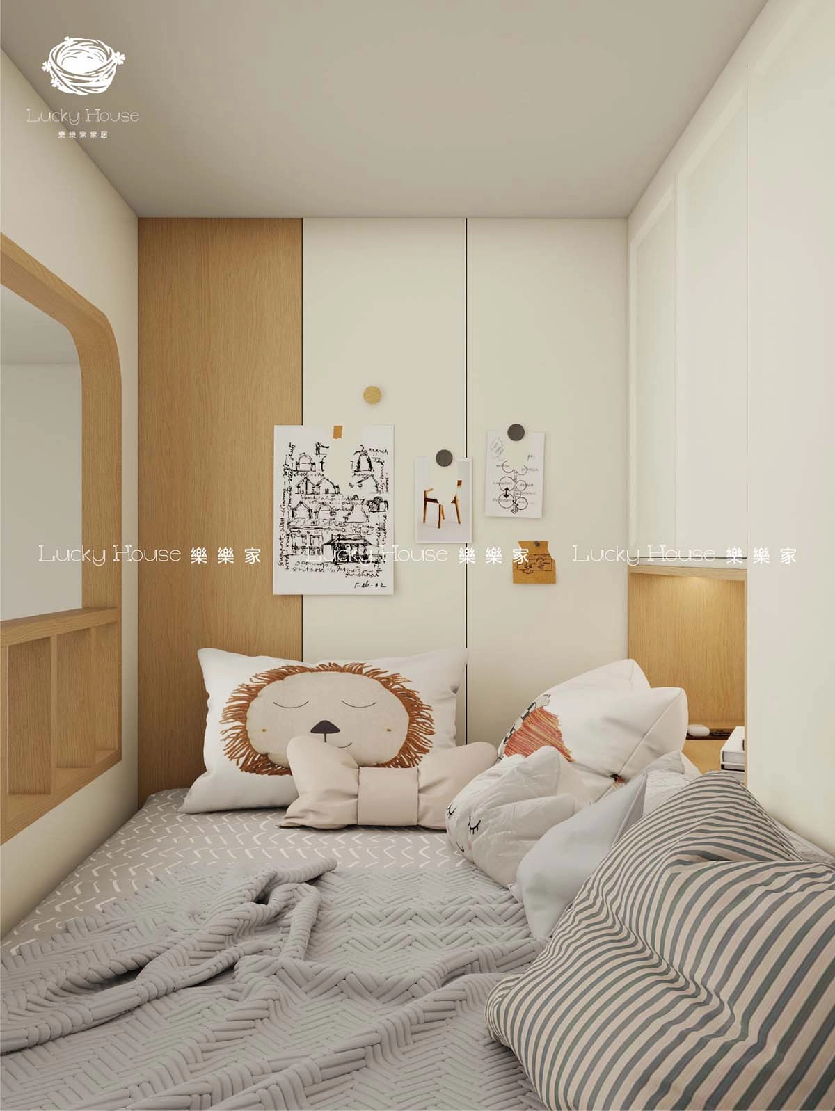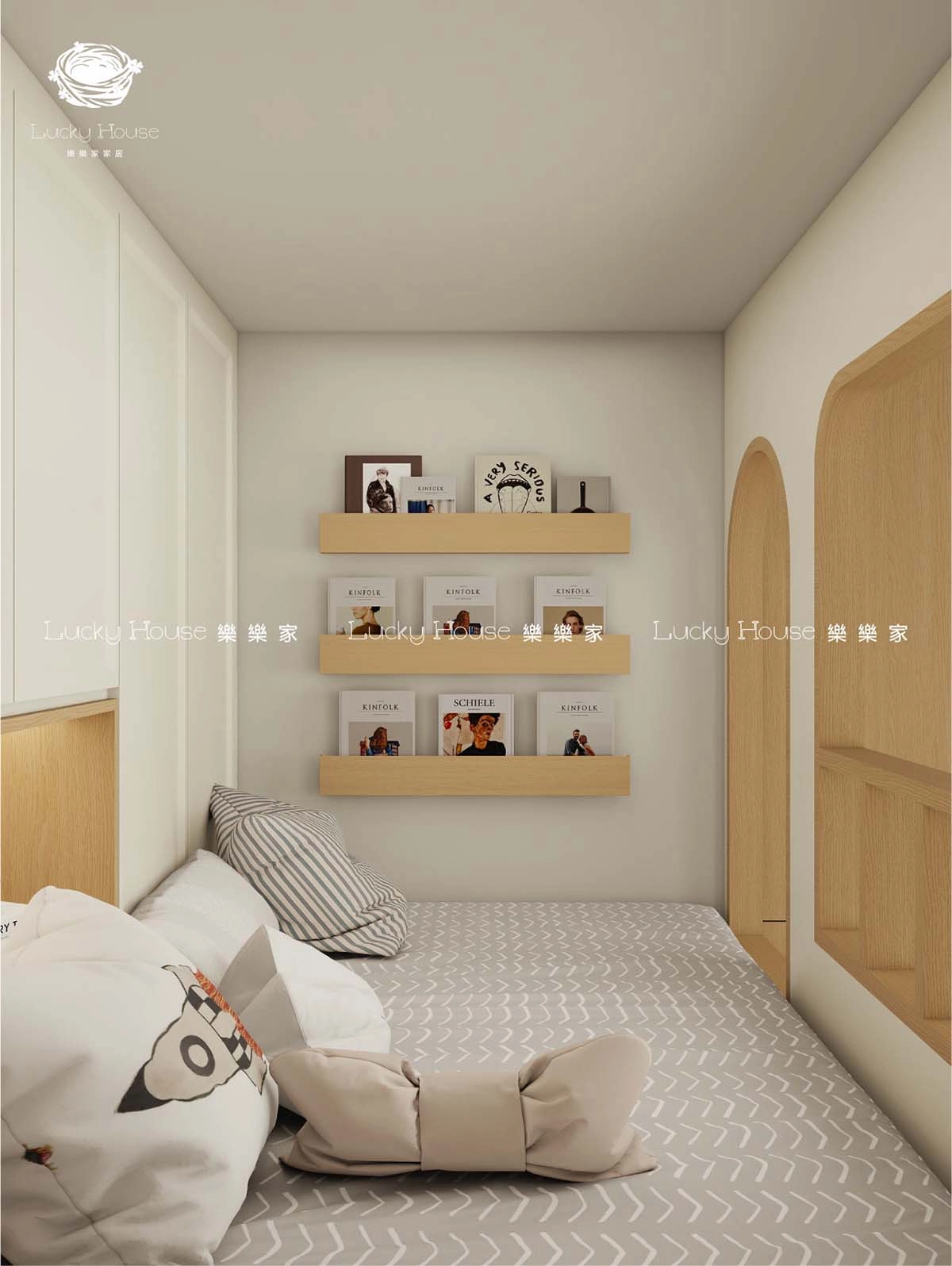 上層規劃成睡眠區,拱門造型嘅開口好有「童話感」,望入去床鋪整潔,牆身鑲嵌木質層架,擺幾張相、小擺件,即刻溫馨到爆;下層櫃體用「米白+淺木」配色,櫃門同抽屜分區收納,冬天被鋪、雜物、玩具統統塞得落,完全唔浪費垂直空間。最正係「上床下櫃」唔會令房間變得壓抑,反而因為開放式拱門同燈光設計,保持通透感,就算細房都住得好鬆郁!