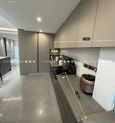 細單位廚房空間有限,呢個L型櫥櫃就岩哂!上櫃用淺灰色面板,下櫃用木紋設計,視覺上有層次又唔會亂。台面用咗耐污嘅石英石,仲留咗位放洗衣機,一櫃多用。櫃底加咗間接燈,煮嘢食時唔會黐住陰暗,成個廚房變得更光猛,就算細細間都唔會覺得局促。