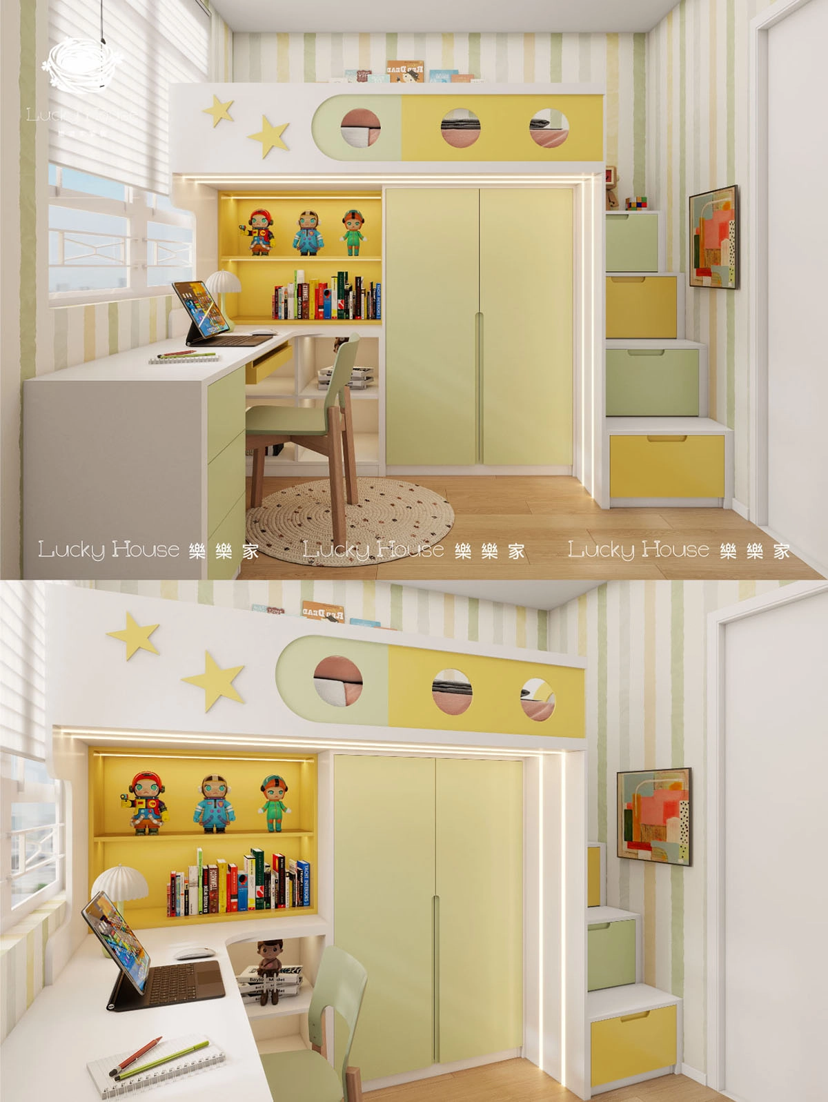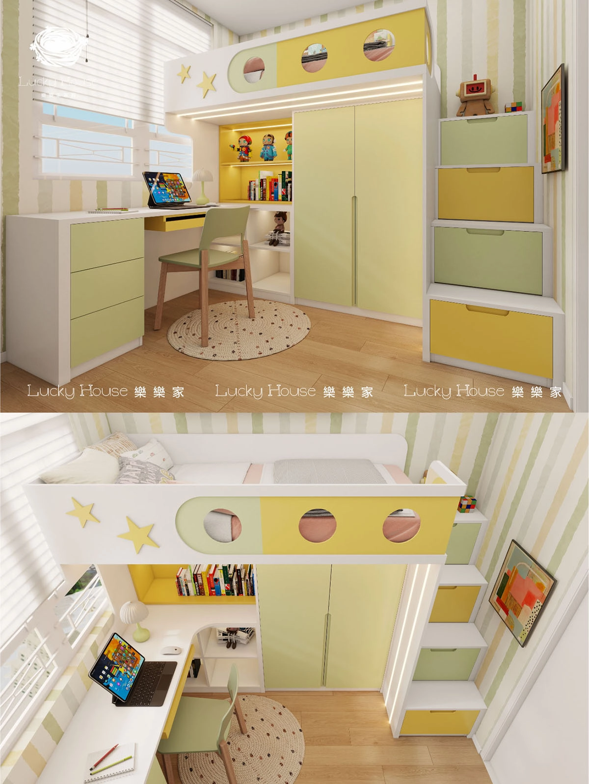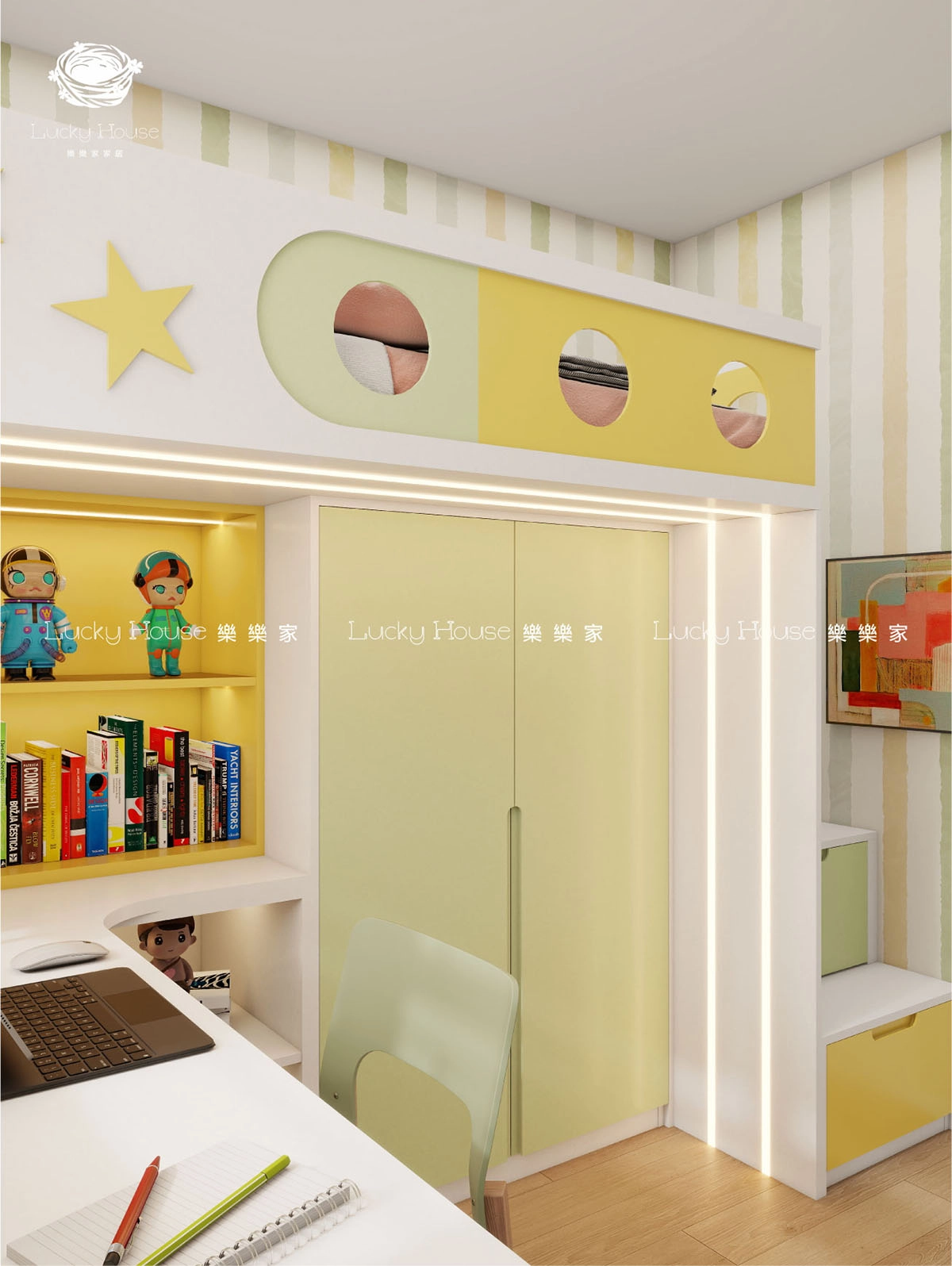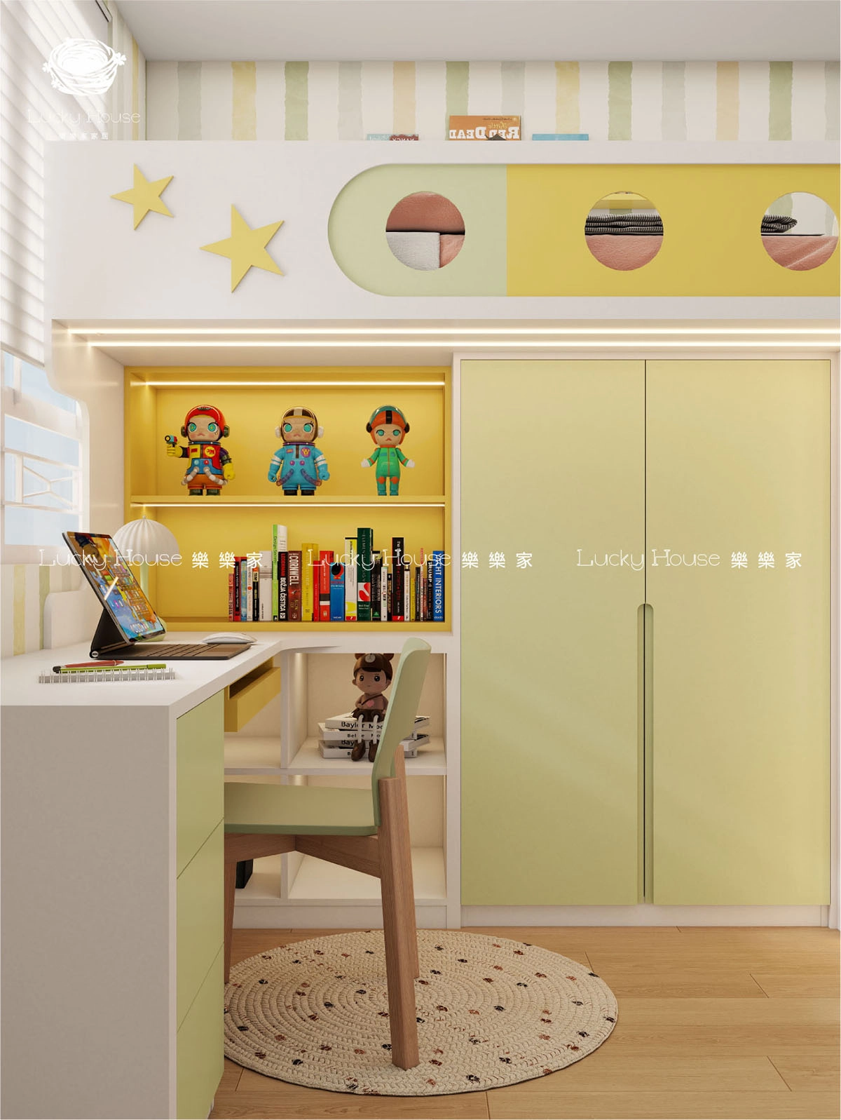 樂樂家向上搵空間,呢個設計直接將房間一分為二:上層做睡眠區,下層改造成學習+收納區。上層睡床圍邊做咗圓形觀景窗,配上星星裝飾,小朋友爬上去就像登陸太空艙,趣味滿分;下層左邊係L型書台,寫功課、畫畫都夠闊落,右邊連接大衣櫃,中間夾住開放式書架,簡直係一條龍服務。