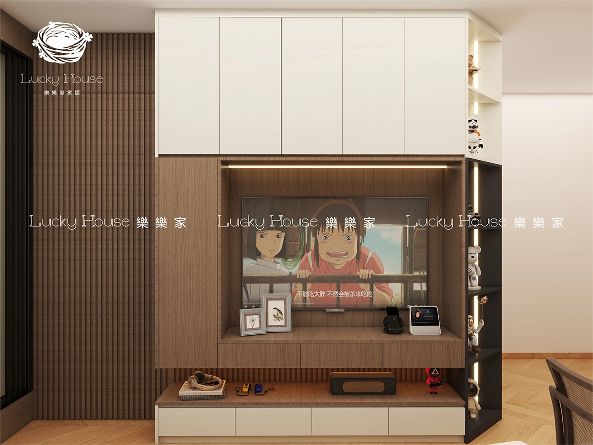 電視櫃設計真係貼心又型格,上層封閉式儲物櫃勁有收納,中間電視嵌入式空間自然協調,仲有層板燈光添氣氛。側邊黑白色開放格擺公仔、相機等裝飾,完全將收納、展示同美觀融合一齊,睇得又用得。
