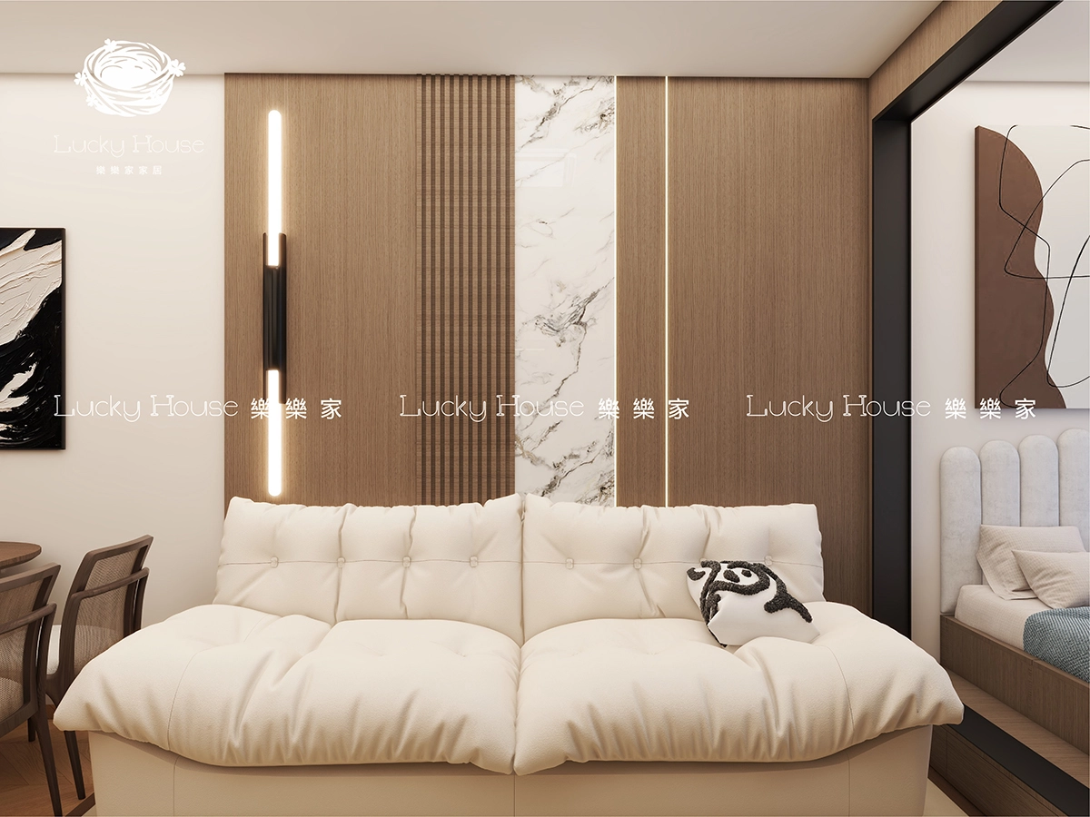 沙發背景墻用咗柵格條match大理石紋,帶出意式輕奢格調。