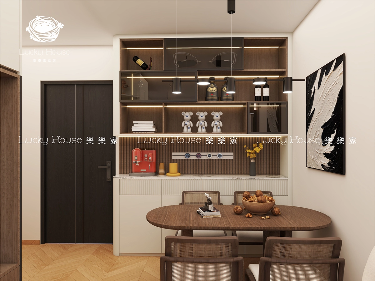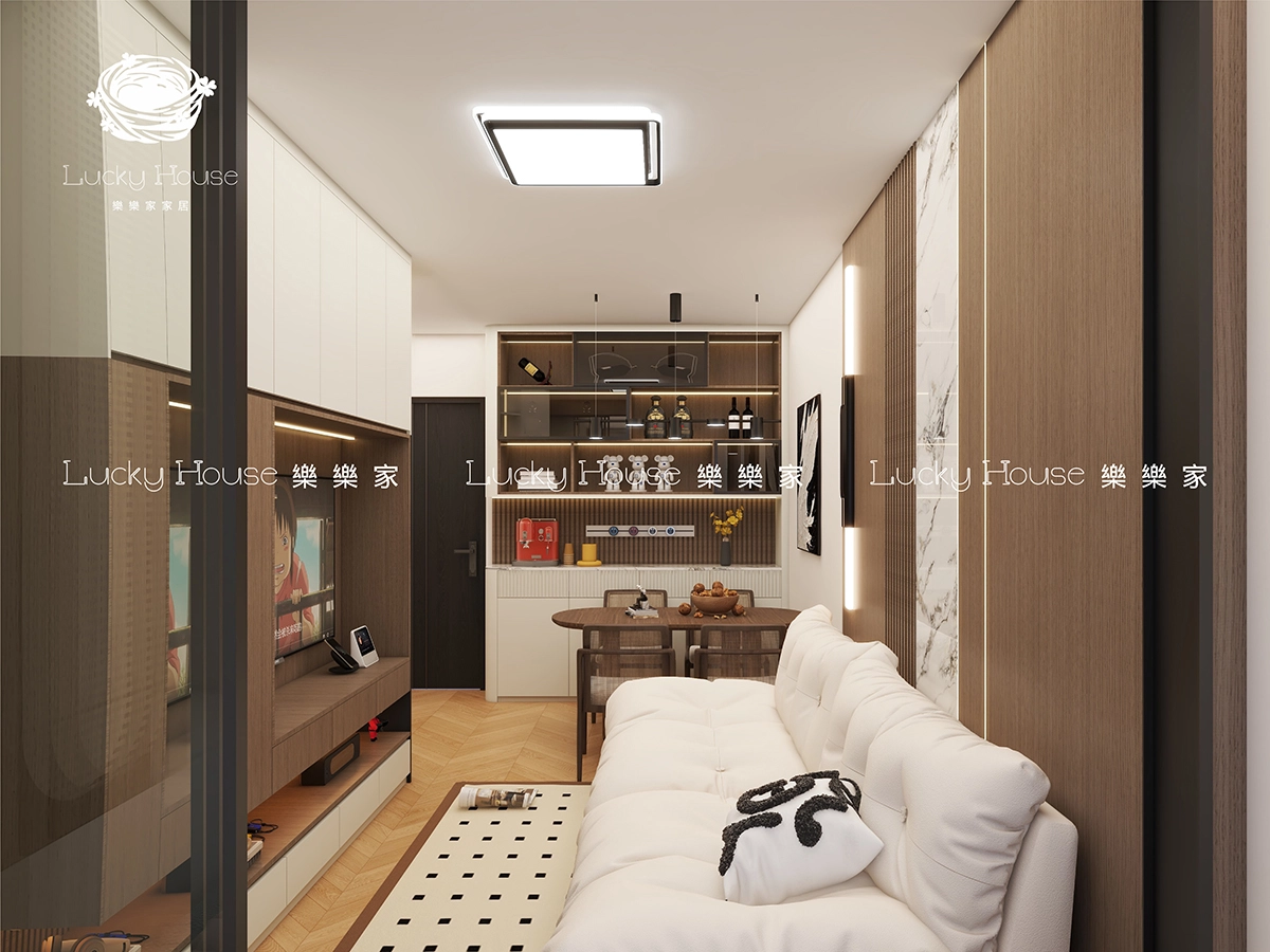 設計理念:以原木色同暖白色主打,流暢嘅線條加玻璃元素、嵌燈工藝,搭配升降台,營造出一個現代多功能性同溫馨氛圍嘅居住環境。