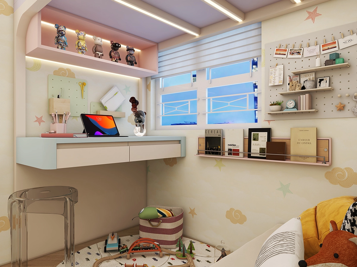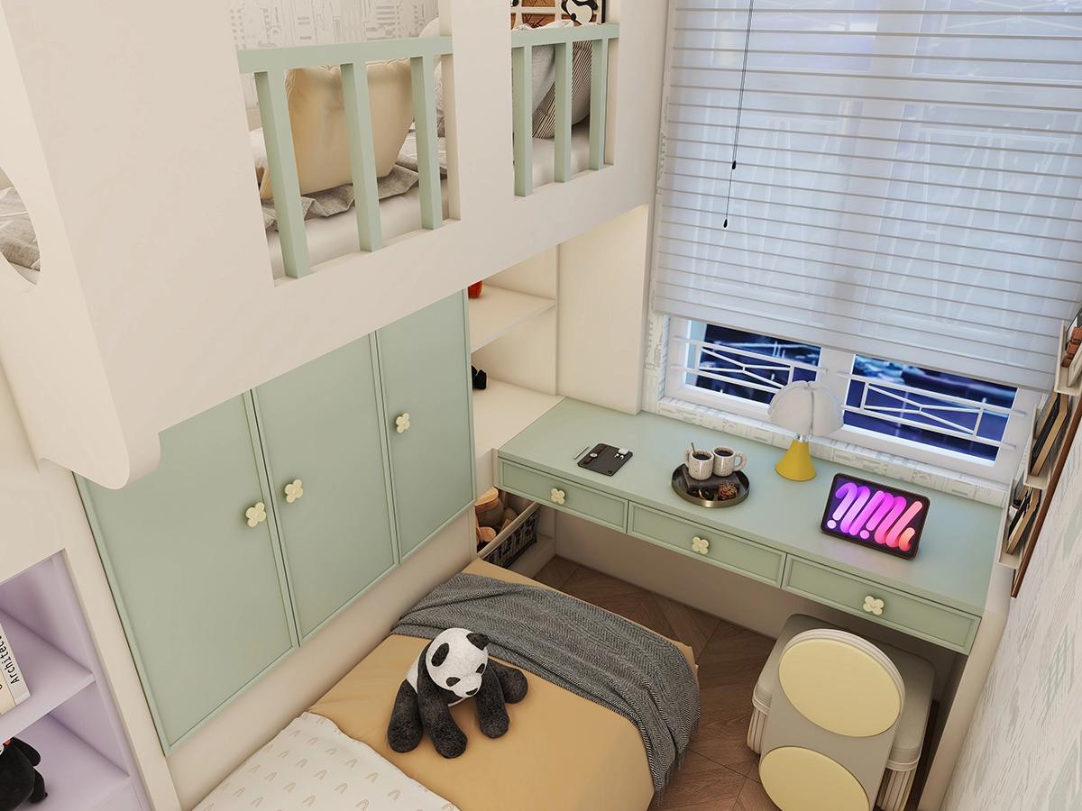 雙層床變形術:初期設計上鋪為遊戲閣樓,下鋪預留父母陪睡空間;中學期可改為獨立單人床+書櫃組合,比如上床下櫃、書台等。