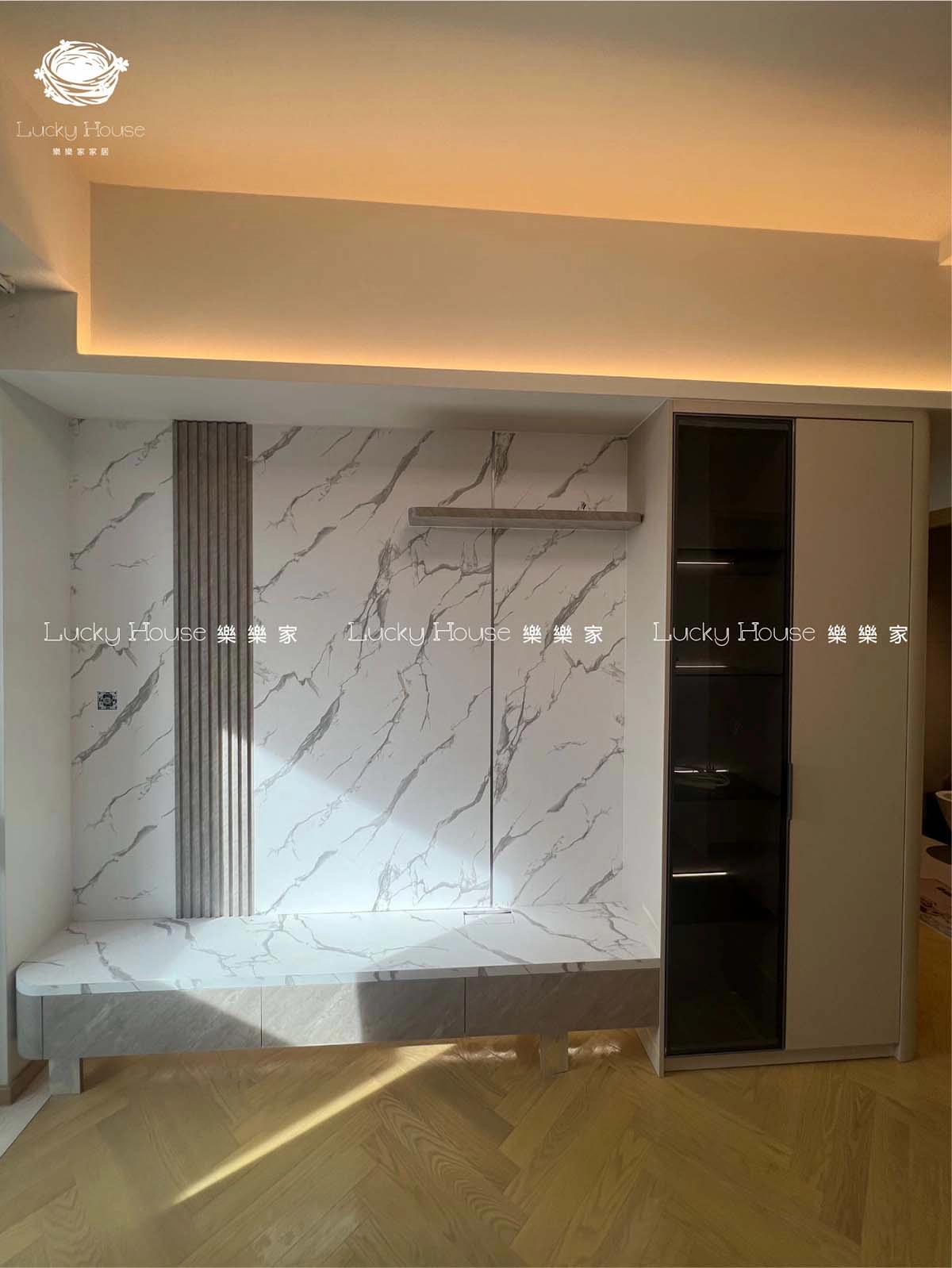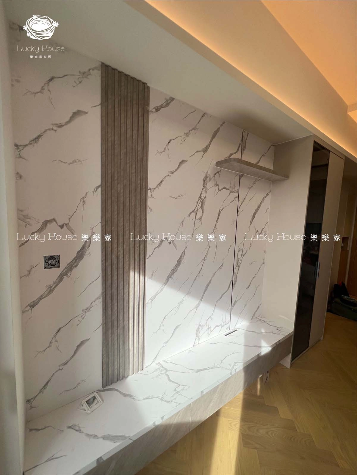 而且佢個L型係貼住牆身同側邊櫃一體成型咁做,望落順眼到飛起。電視背景牆用咗大理石紋板材,高級感瞬間拉滿;仲有條豎條裝飾條,層次感即刻出嚟。