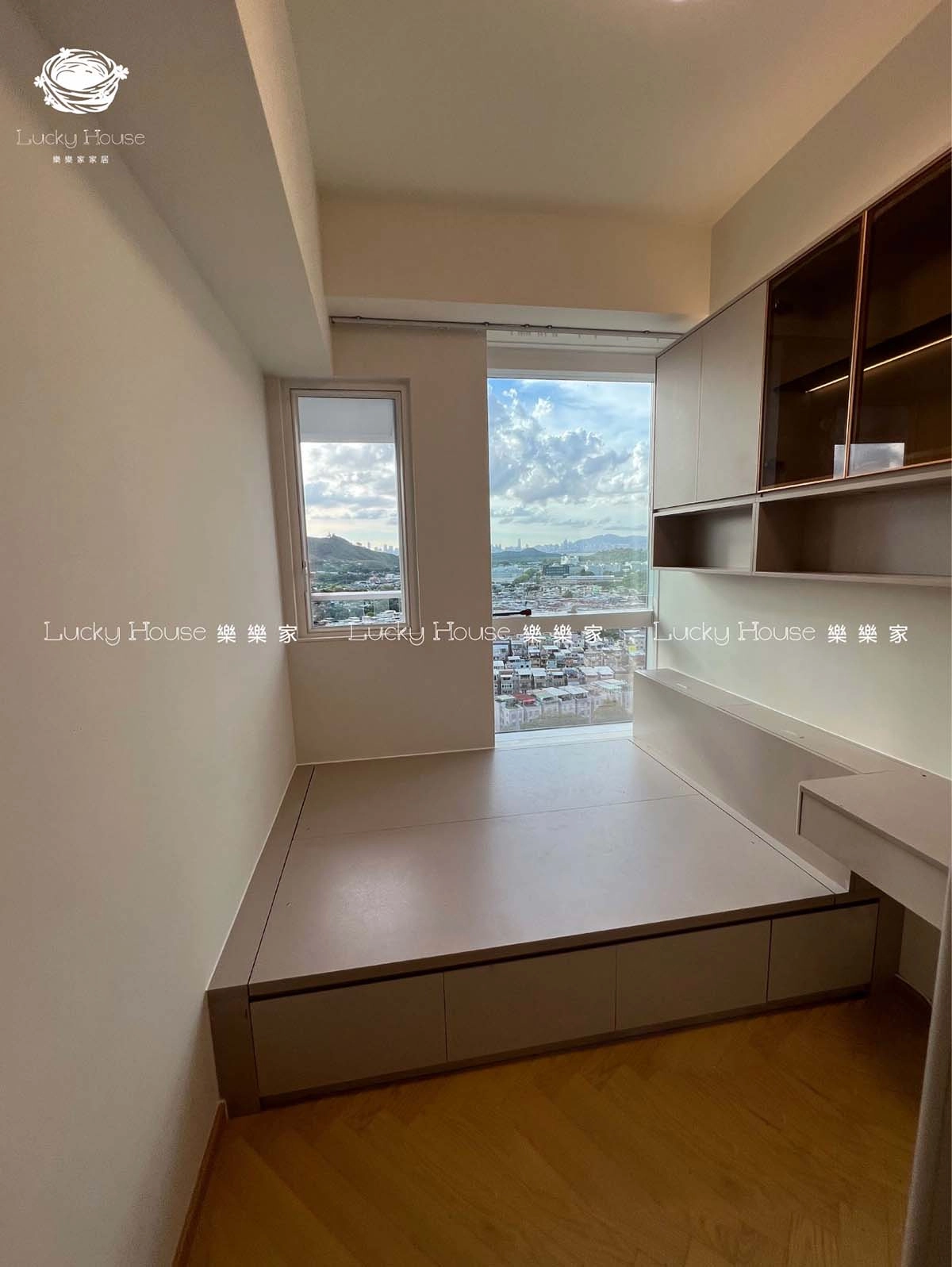 床嘅周圍仲做埋同色系櫃體,成個空間好統一;而且張床高度啱啱好,坐喺度完全唔覺得焗促。