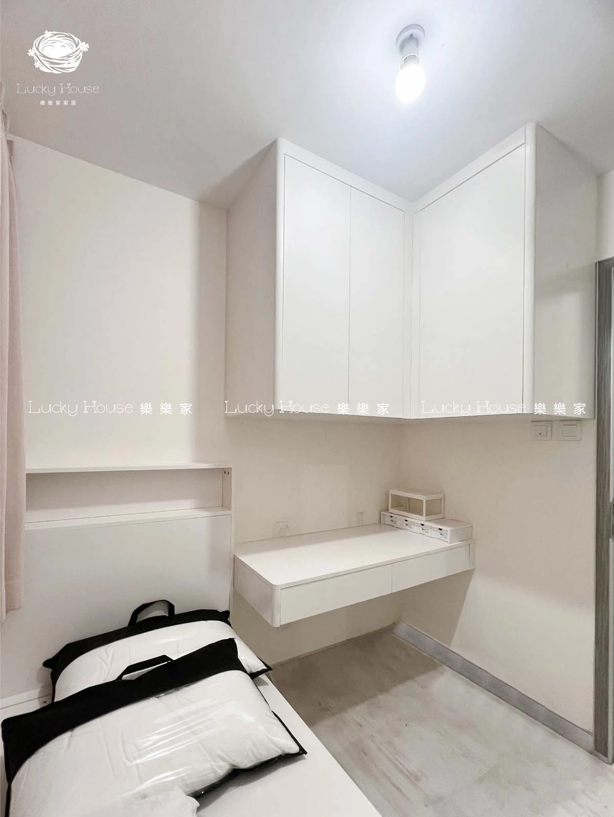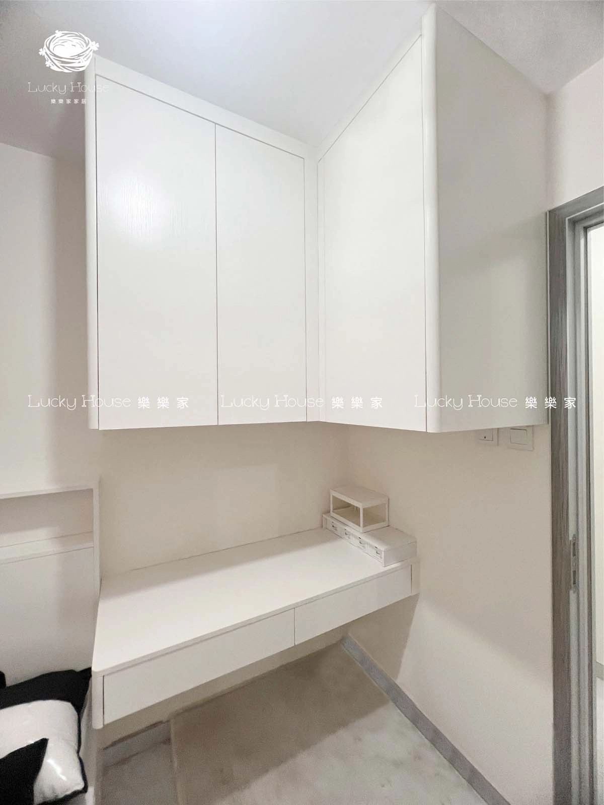 L型吊櫃主要出現喺睡房或者其他需要儲物嘅空間。呢個吊櫃利用咗牆身嘅垂直空間,將上方空間充分利用起嚟。吊櫃嘅儲物量好大,可以放好多衣物、床上用品等等。而且,L型嘅設計可以適應唔同嘅牆角位置,令空間利用更加靈活。白色嘅吊櫃外觀簡潔,睇起身好乾淨整齊,畀房間一種寬敞明亮嘅感覺。