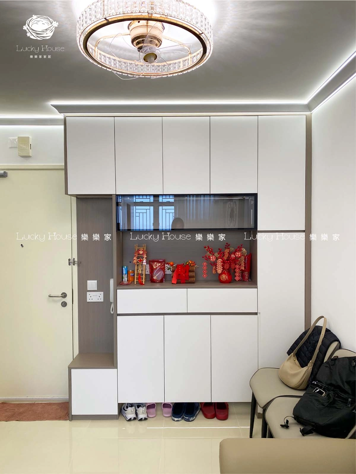 C 字櫃位於入戶區域,以獨特嘅造型同實用性成為亮點。佢整合咗鞋櫃、裝飾展示同換鞋坐櫈功能:上方封閉櫃體提供大容量收納,中間留空區域可擺放裝飾品或日常小物,下方則用於鞋履收納,側邊嘅坐凳設計方便換鞋,令入戶空間既整潔又充滿生活溫度。