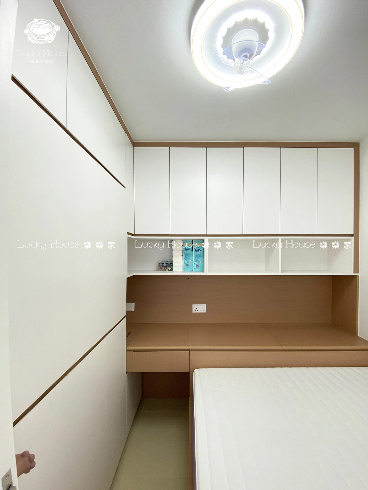 樂樂家公屋全屋訂製,設計實用美觀嘅C字櫃、電視櫃、地台床及櫥櫃,令每個角落都充滿溫馨同美感。