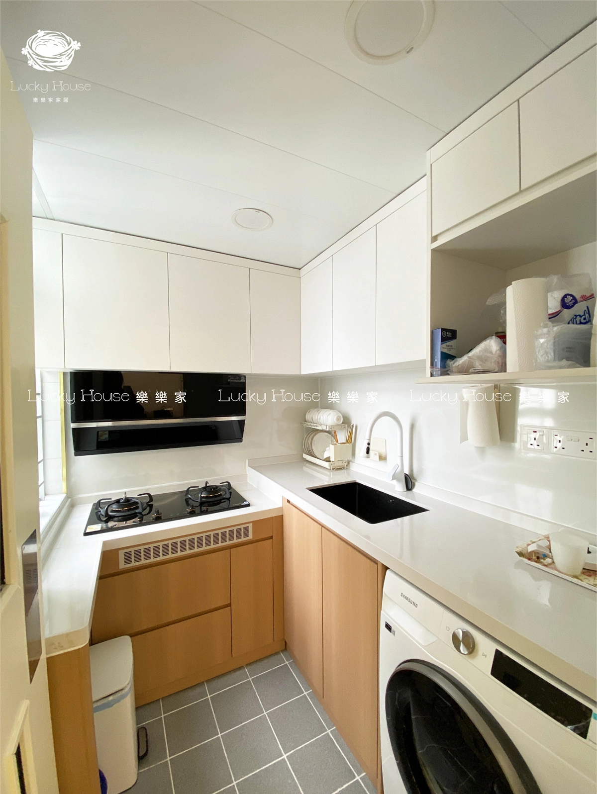 L 型櫥櫃緊貼廚房角落,形成流暢嘅操作動線(洗、切、煮)。上方吊櫃同下方櫥櫃提供充足收納,隱藏廚房雜物;檯面空間連貫,提升操作便利性。搭配嵌入式家電(如洗衣機、抽油煙機),令廚房既高效又美觀,成為家庭美食嘅理想創作地。